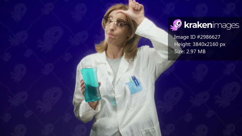 Woman doctor holds mouthwash bottle, hand forming l on forehead in studio; playful health reassurance.