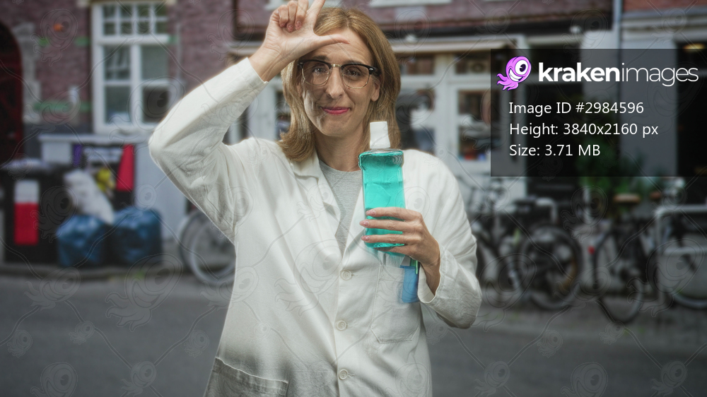 Woman doctor holds mouthwash bottle with hands and points finger to label on street; oral health playful.