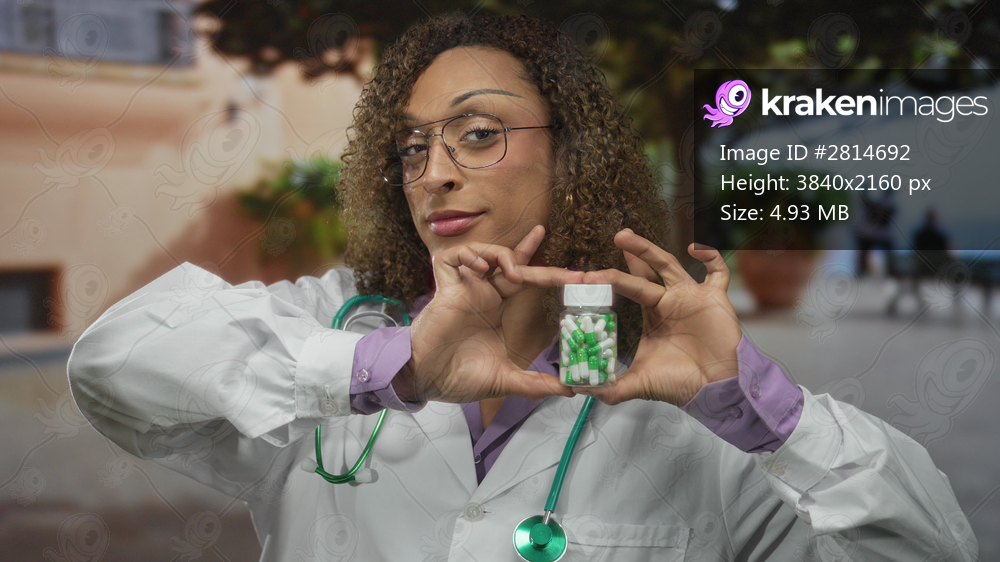 Woman doctor holds pill bottle with both hands near stethoscope on city street; compassion trust healing wellness.