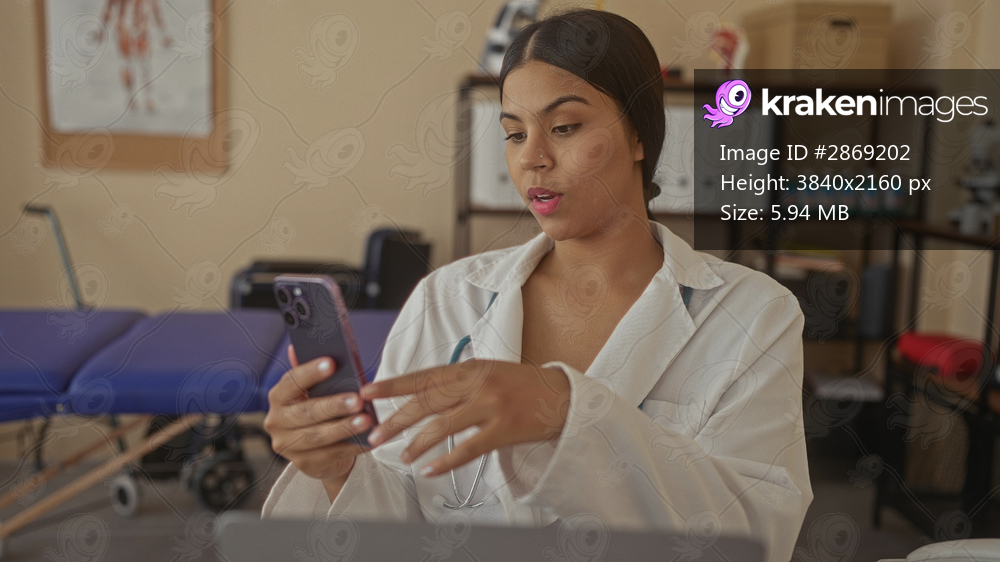 Woman doctor holds smartphone in clinic with stethoscope draped around neck and blue examination table visible behind her; telehealth empathy.