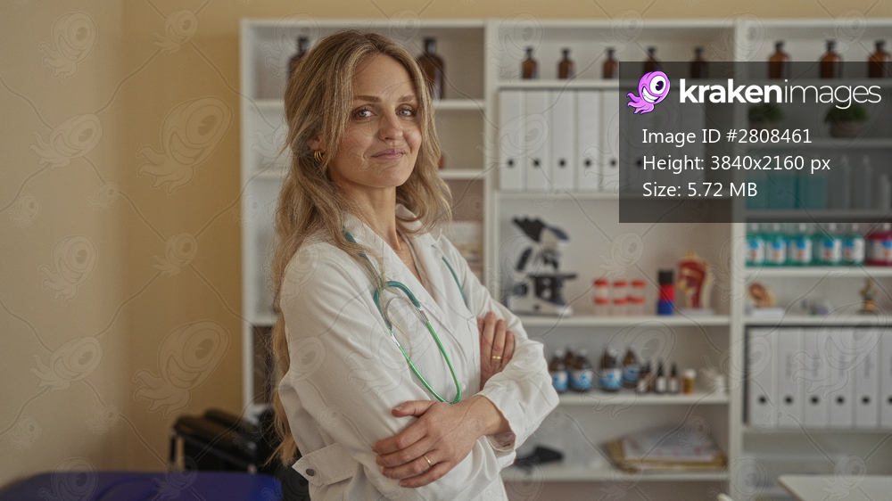 Woman doctor in a clinic room with stethoscope, wearing uniform, blonde hair, smiling confidently, hospital interior, shelves in background, medical equipment visible. - Kraken Images