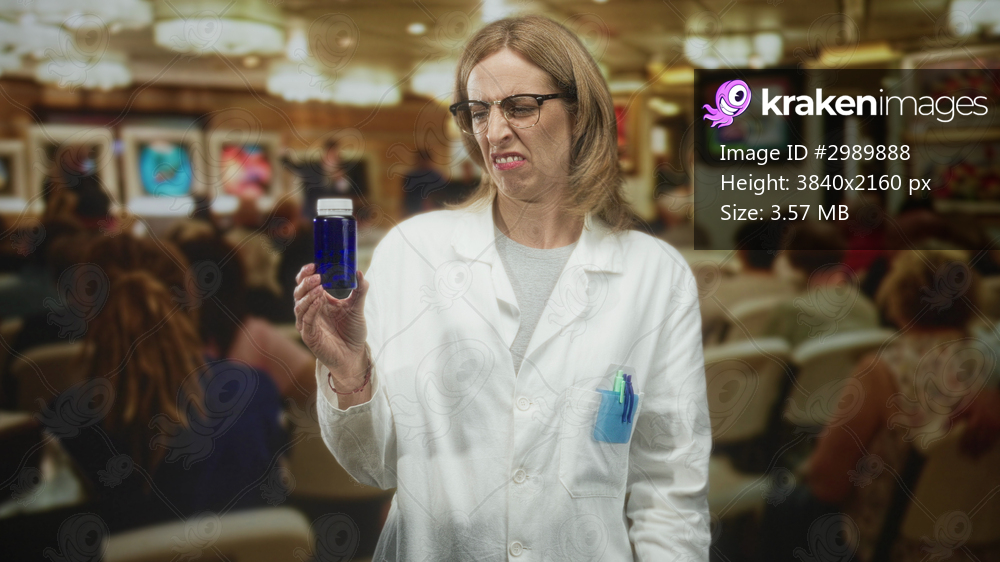 Woman doctor in a labcoat grimaces while holding a blue medicine bottle in an auditorium presentation filled with seated audience; disgust doubt.