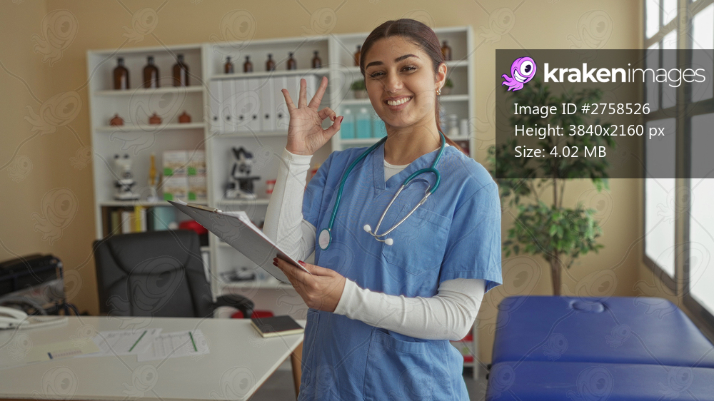 Woman doctor in blue scrubs gestures ok in a hospital room, holding a clipboard surrounded by medical equipment and supplies, exemplifying healthcare professionalism indoors. - Kraken Images