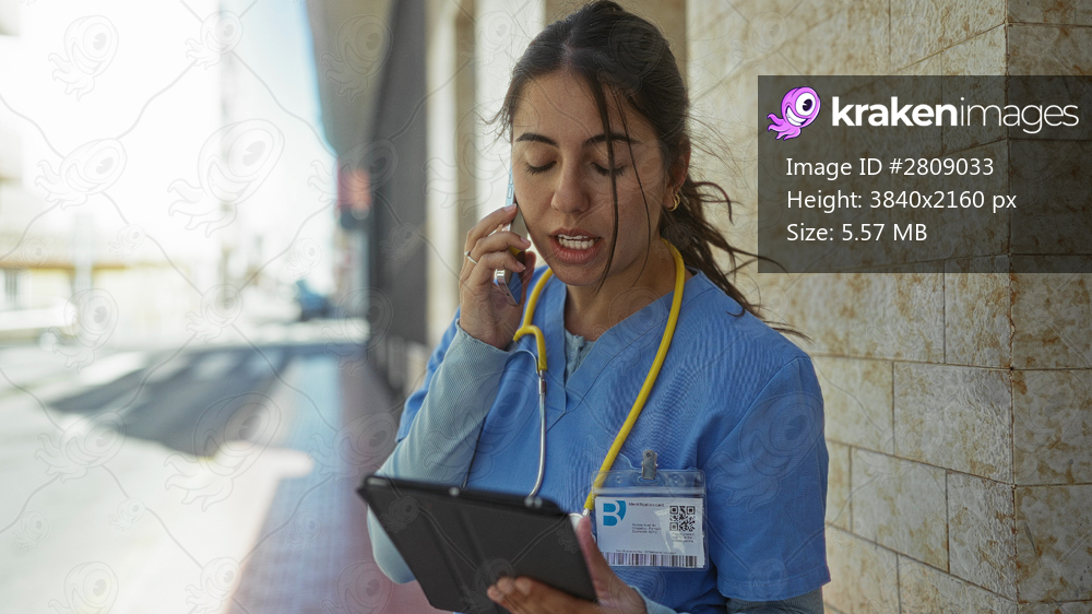 Woman doctor in blue scrubs holds a tablet and stethoscope while speaking urgently on phone against a sunlit street wall; stress duty.