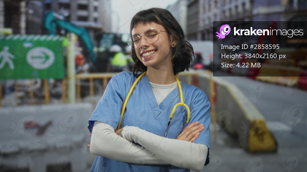 Woman doctor in blue scrubs points finger to object at construction site outdoors with yellow stethoscope around neck; determination.