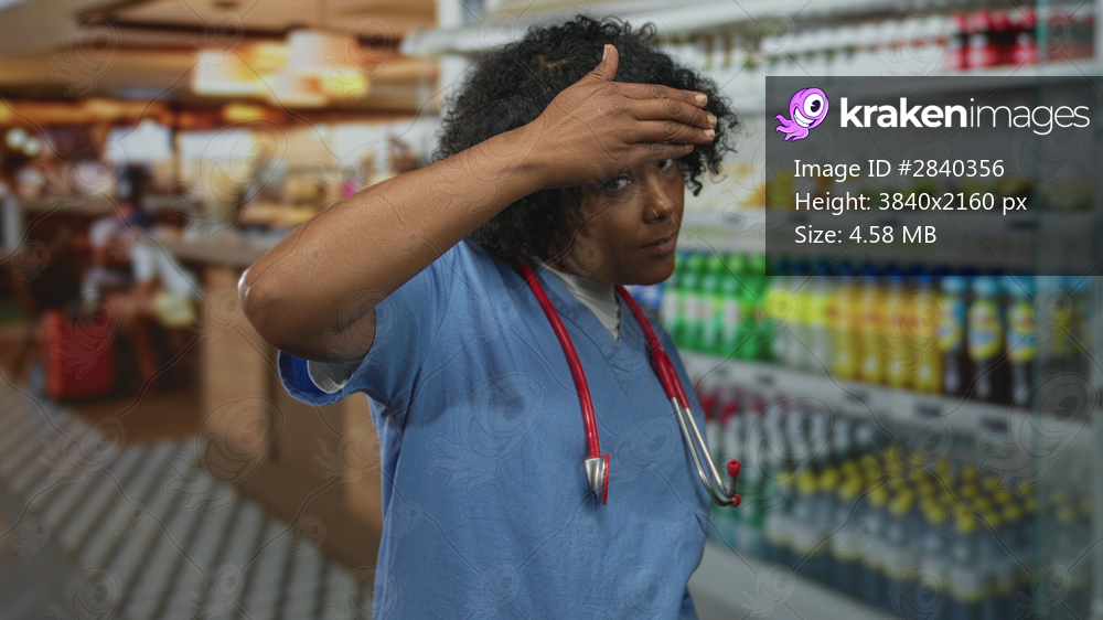 Woman doctor in blue scrubs with stethoscope covers face with hand in building aisle with shelves of bottles; fatigue.