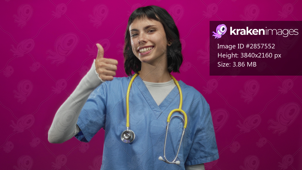 Woman doctor in blue scrubs with stethoscope giving thumbs up in studio; confidence compassion service.
