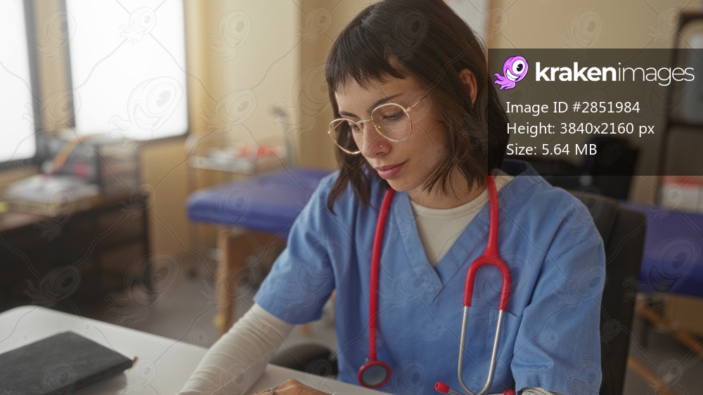Woman doctor in blue scrubs wearing stethoscope crosses arms in clinic; confidence care compassion professionalism.