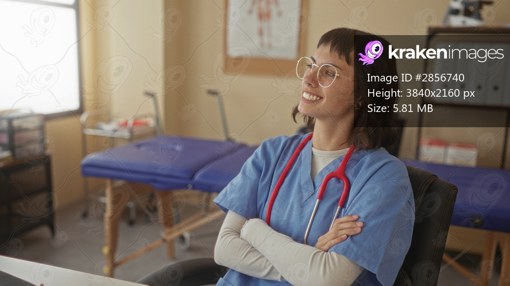 Woman doctor in blue scrubs wearing stethoscope crosses arms in clinic; confidence care compassion professionalism.