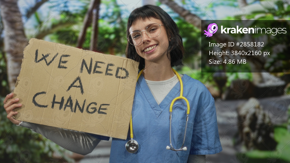 Woman doctor in blue scrubs with yellow stethoscope holding cardboard sign reading we need a change in green park; hope justice reform solidarity.