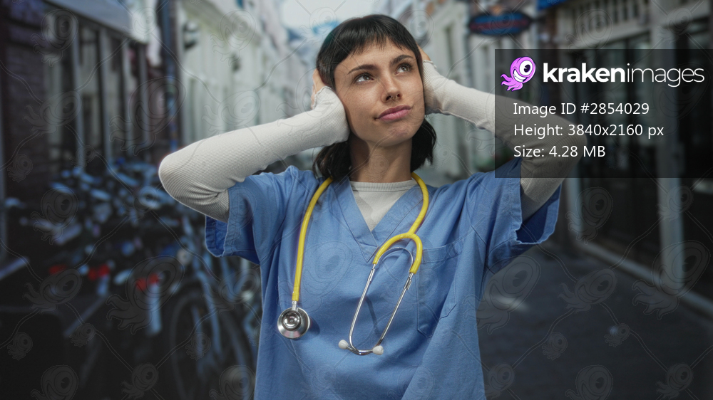 Woman doctor in blue scrubs with yellow stethoscope holds bare hands to ears on street; frustration.