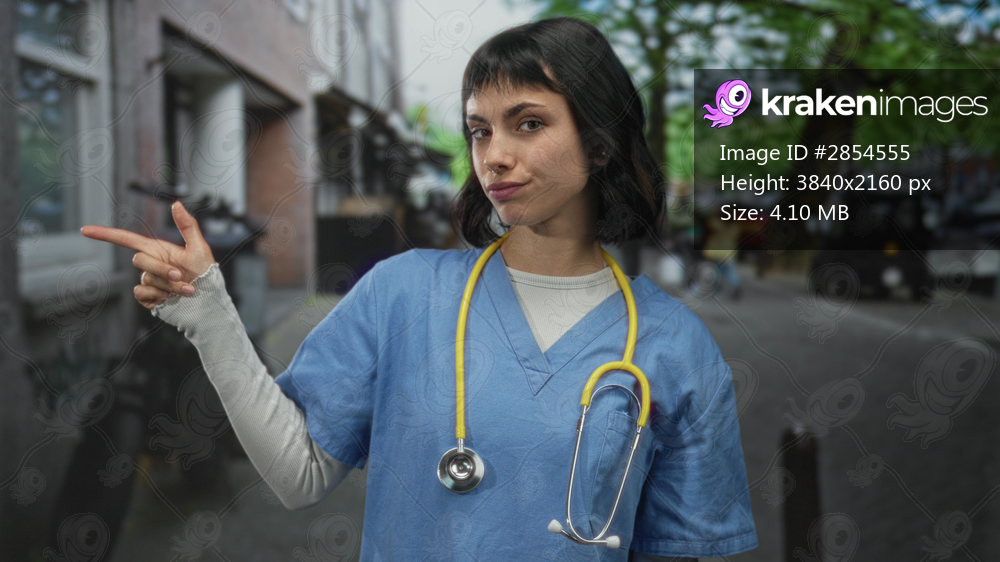 Woman doctor in blue scrubs with yellow stethoscope holds hand to ear for call gesture on city street; compassion.