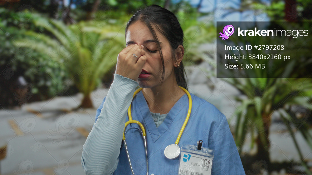 Woman doctor in blue uniform with stethoscope, standing outdoors in green park, pinching nose in fatigue gesture, hispanic, young, healthcare setting, natural background in daylight. - Kraken Images