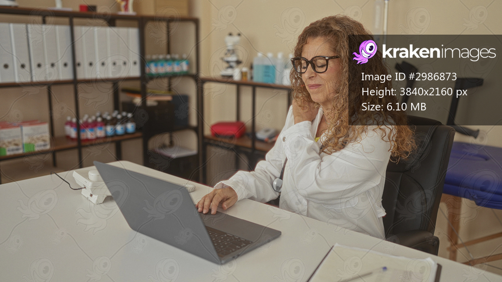 Woman doctor in clinic at desk with laptop and stethoscope, touching neck and shoulder while seated; discomfort.