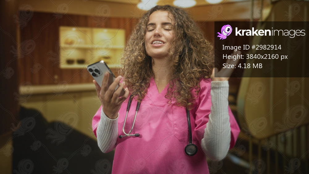 Woman doctor in clinic holding smartphone with palms up in a questioning gesture, stethoscope visible and curly hair framing face; frustration.