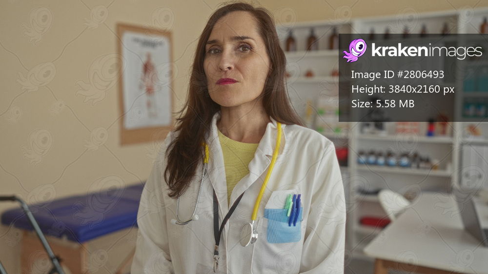 Woman doctor in clinic with stethoscope raising hand in gesture of stop in medical office filled with equipment and supplies.