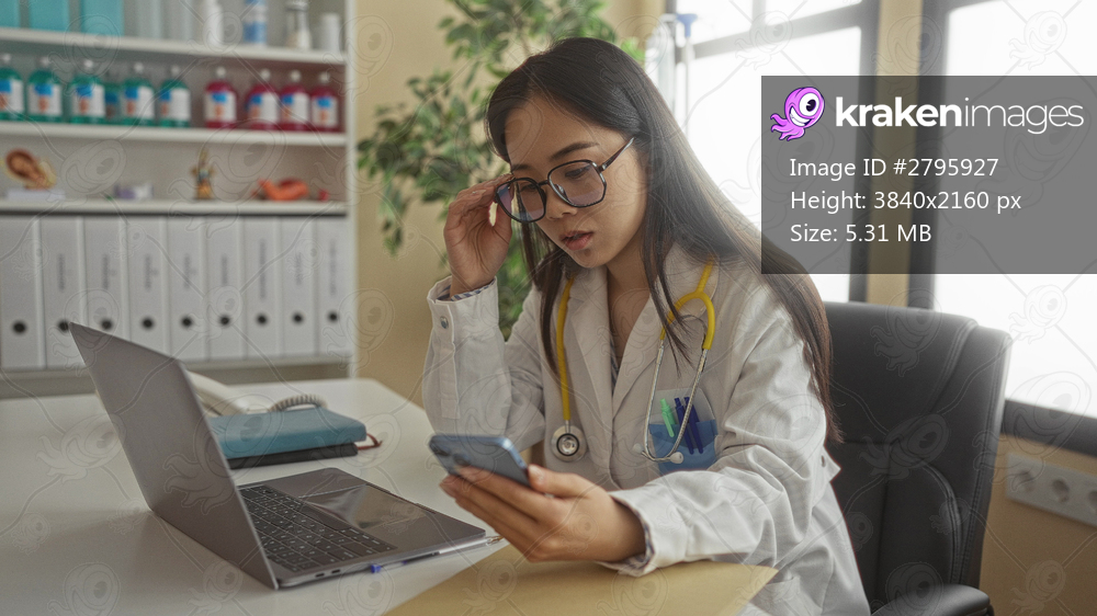 Woman doctor in clinic using smartphone and laptop, wearing stethoscope, young and chinese, indoors in hospital room, focused on work tasks at organized workplace with files. - Kraken Images