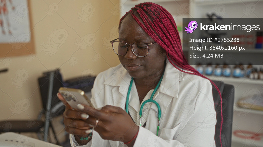 Woman doctor in clinic wearing glasses and lab coat with stethoscope, focused on task, surrounded by medical equipment and shelving, conveying a professional and dedicated atmosphere - Kraken Images
