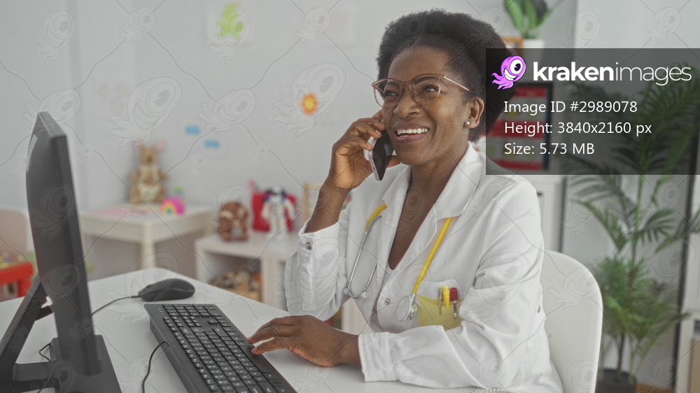 Woman doctor in coat holding phone to ear while typing at a computer on a clinic desk in a building; compassionate care support.