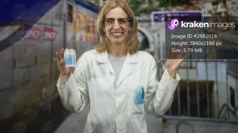 Woman doctor in lab coat holding swab container and making ok gesture on a train station platform; calm safety reassurance.