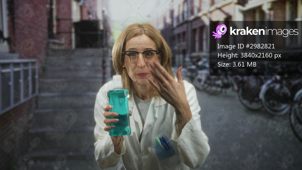 Woman doctor in lab coat holding teal mouthwash bottle, smiling mouth and pointing hand toward camera on street; cheerful promotion.