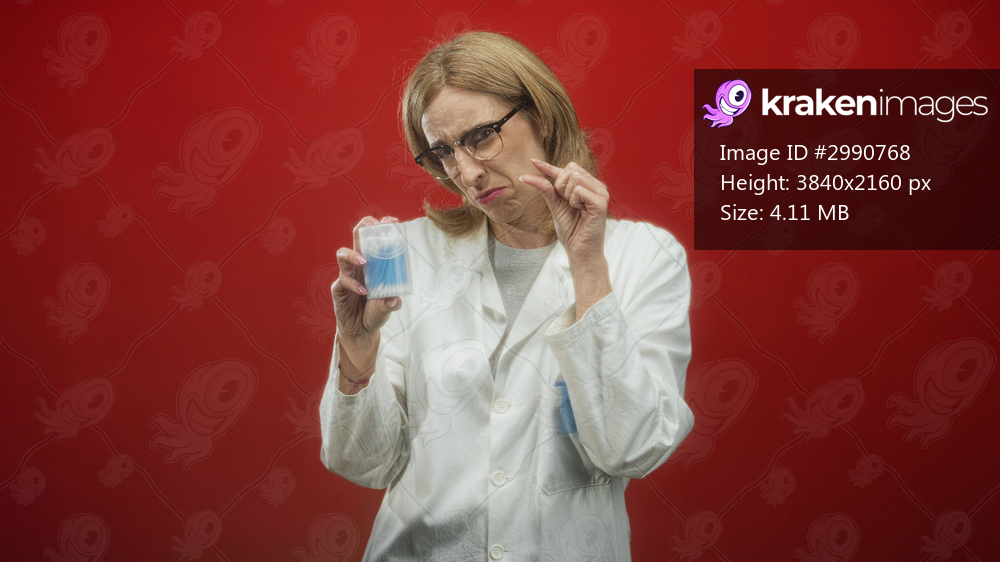 Woman doctor in lab coat pinches a swab between fingers in studio with red backdrop; professional skepticism.