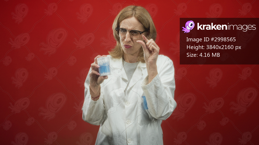 Woman doctor in lab coat pinches a swab between fingers in studio with red backdrop; professional skepticism.