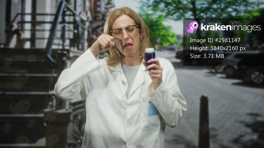 Woman doctor in lab coat pinches nose while holding blue medicine bottle on city street with parked cars and steps; disgust warning.