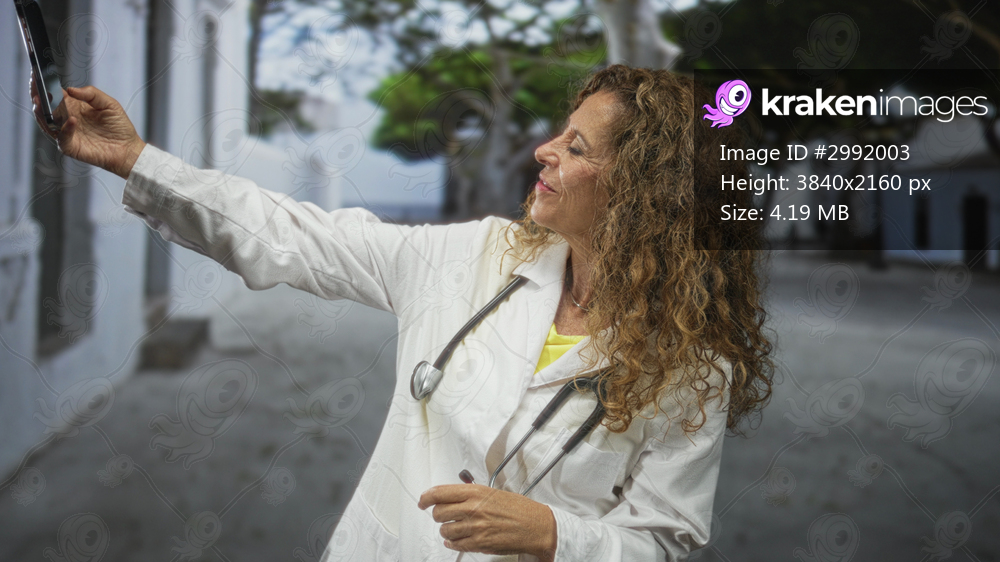 Woman doctor in labcoat holding smartphone for selfie on a quiet street with white buildings and trees, stethoscope visible; confidence wellness.