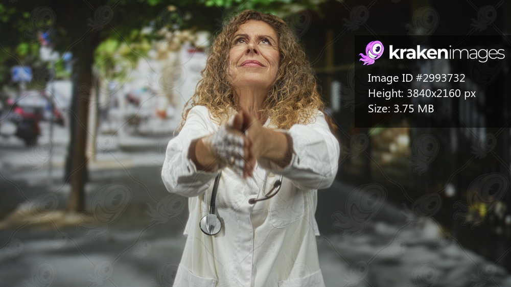 Woman doctor in labcoat with stethoscope, middleage senior, hands pressed together in praying gesture on a city street with trees and sidewalk; care healing compassion. - Kraken Images
