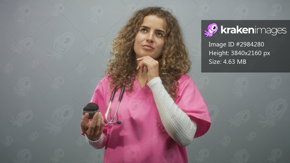 Woman doctor in pink scrubs holds a chocolate muffin in hand with finger to chin and stethoscope visible in studio; thoughtful curiosity.