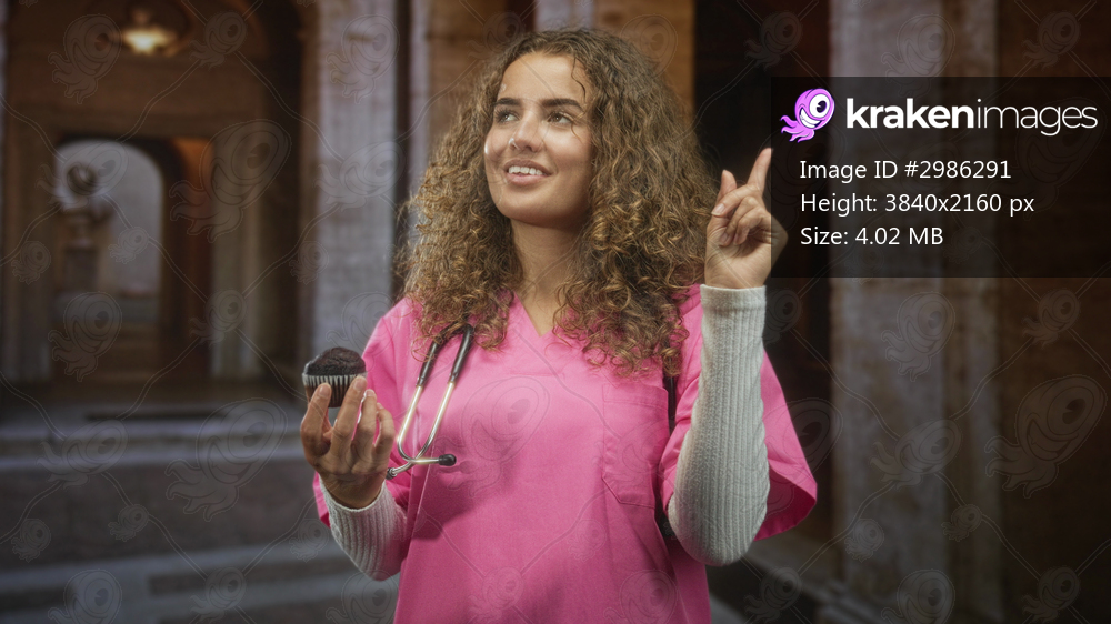 Woman doctor in pink scrubs holds a chocolate muffin and points index finger up in a stone building corridor; playful curiosity.