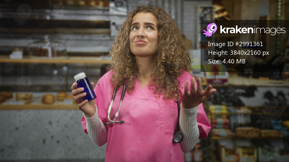 Woman doctor in pink scrubs holds blue pill bottle and shrugs with open palm in building; confusion dilemma.