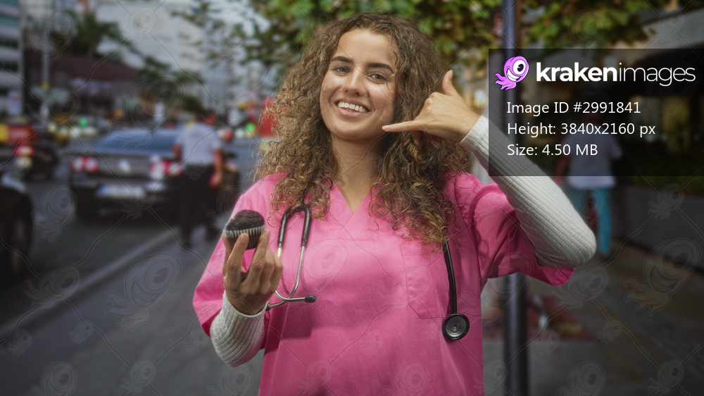 Woman doctor in pink scrubs holds chocolate muffin and stethoscope while making a thumb to ear phone gesture on a street; playful break.