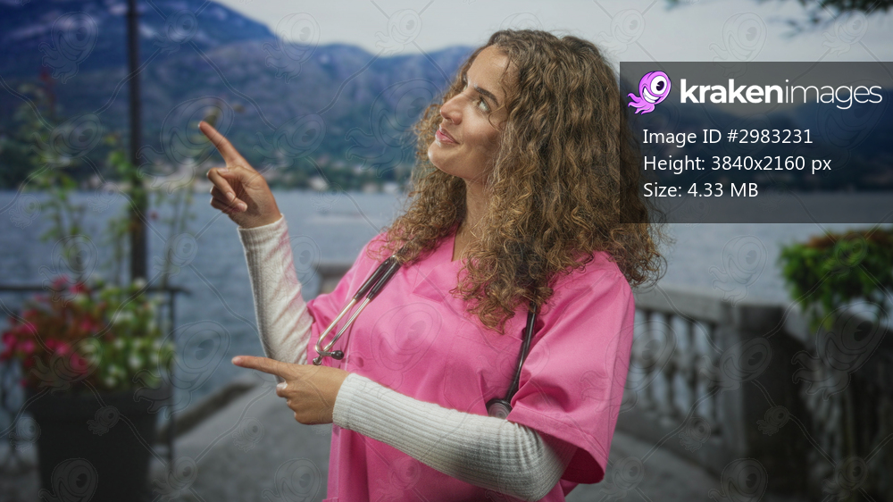 Woman doctor in pink scrubs points finger with stethoscope on building balcony by the lake; healing care confidence.