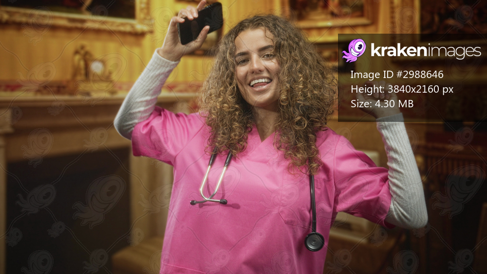 Woman doctor in pink scrubs smiling and dancing with phone raised, stethoscope visible, arms up in an ornate building; celebration joy.