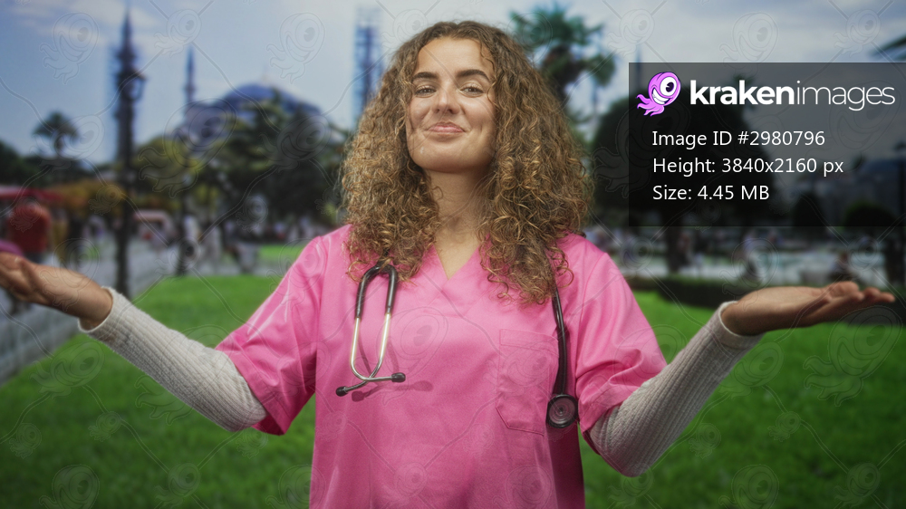 Woman doctor in pink scrubs with stethoscope, arms open palms up in park by historic building; healing gratitude.