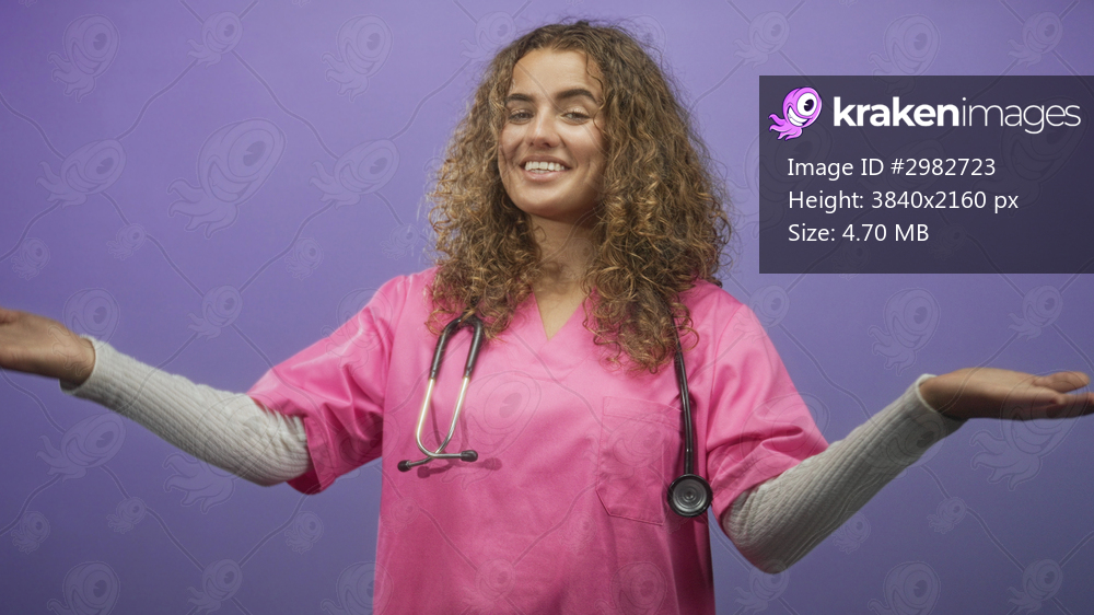 Woman doctor in pink scrubs with stethoscope, hands open and outstretched in studio; compassionate care welcoming.