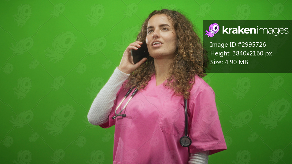 Woman doctor in pink scrubs with stethoscope holding phone to ear, talking and hand to ear in studio; concern urgency.
