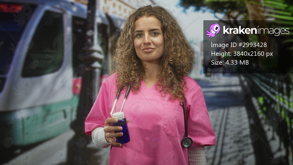 Woman doctor in pink scrubs with stethoscope holding pill bottle in right hand near chest on street tramway; compassion.