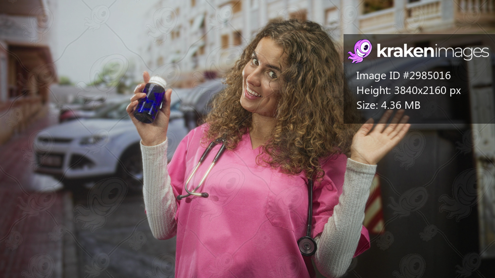 Woman doctor in pink scrubs with stethoscope holding pill bottle and waving hand in street near parked cars; compassion trust wellness.