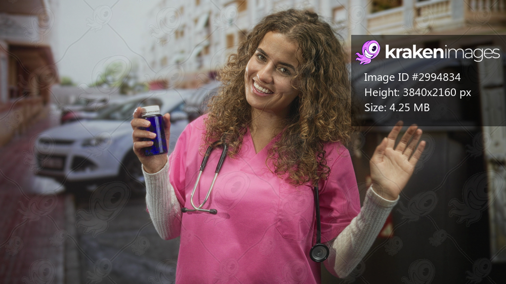 Woman doctor in pink scrubs with stethoscope holding pill bottle and waving hand in street near parked cars; compassion trust wellness.