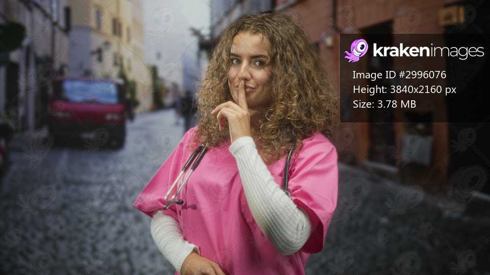 Woman doctor in pink scrubs with stethoscope holds finger to lips for silence on a cobblestone street; secrecy.