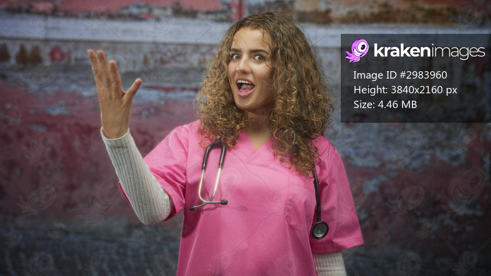 Woman doctor in pink scrubs with stethoscope presses fingers to lips gesture in front of building; thoughtful contemplation.