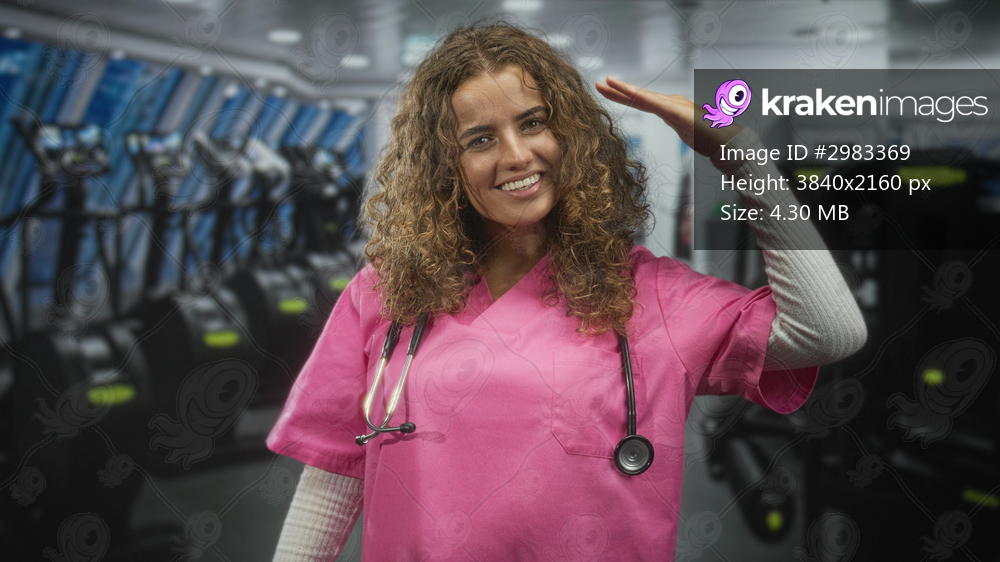Woman doctor in pink scrubs with stethoscope raises hand to head in gym building, smiling and facing camera; wellness support cheerful.