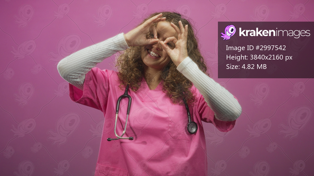 Woman doctor in pink scrubs with stethoscope smiles and makes hand binoculars gesture to eyes in studio; playful.