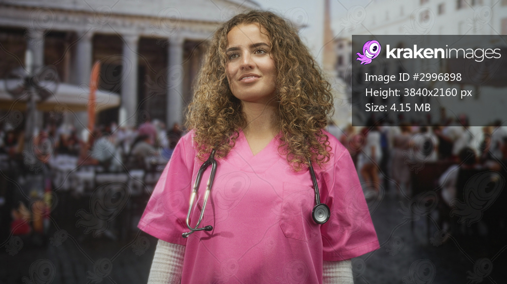 Woman doctor in pink scrubs with stethoscope smiles and stands with hands relaxed in front of a historic building crowded with people; confidence.