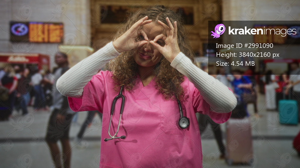 Woman doctor in pink scrubs with stethoscope smiling and raising hands in busy airport terminal among travelers; compassion healing.