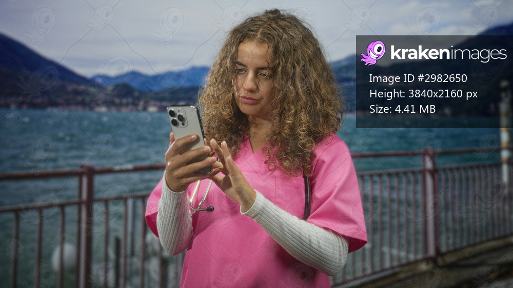 Woman doctor in pink scrubs tapping smartphone screen with bare hand while holding stethoscope by waterfront railing on street; concentration telehealth inquiry. - Kraken Images