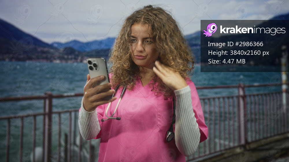 Woman doctor in pink scrubs tapping smartphone screen with bare hand while holding stethoscope by waterfront railing on street; concentration telehealth inquiry. - Kraken Images